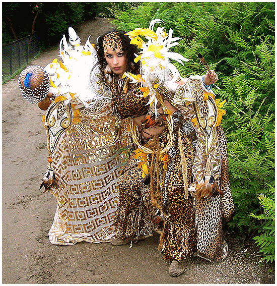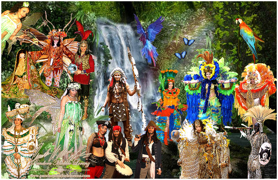 Jedes der Kostüme hat einen eigenen Charakter, welches den Zuschauern beim Anblick offenbart wird. Mal wie ein seltener tropischer Vogel, schön, leicht, scheu und trotzdem recht neugierig; mal Elfenhaft zart und verspielt mit einem sanften Seifenblasenregen; mal als die Sonne, Lebensenergiespendend und fröhlich strahlend; mal majestätisch stolz und beherrscht als dunkle Königin der Nacht; mal als hungrig, verschlingender, Kannibale auf der suche nach frischem zarten Menschenfleisch; mal als gestrandeter Pirat auf Schatzsuche, mit original antiken Waffen; ... sowie diverse weitere Themenkostüme zu z. B. 1001 Nacht; Zigeuner; Karibik; Afrika; Clown; Halloween; Weihnachtszauber; ... .