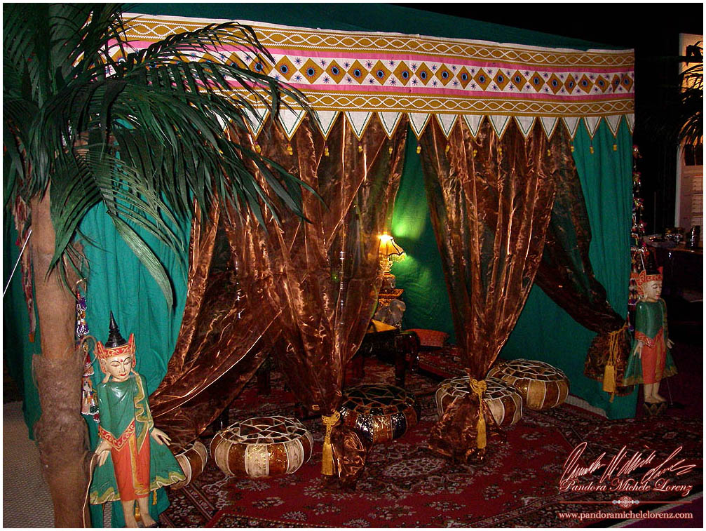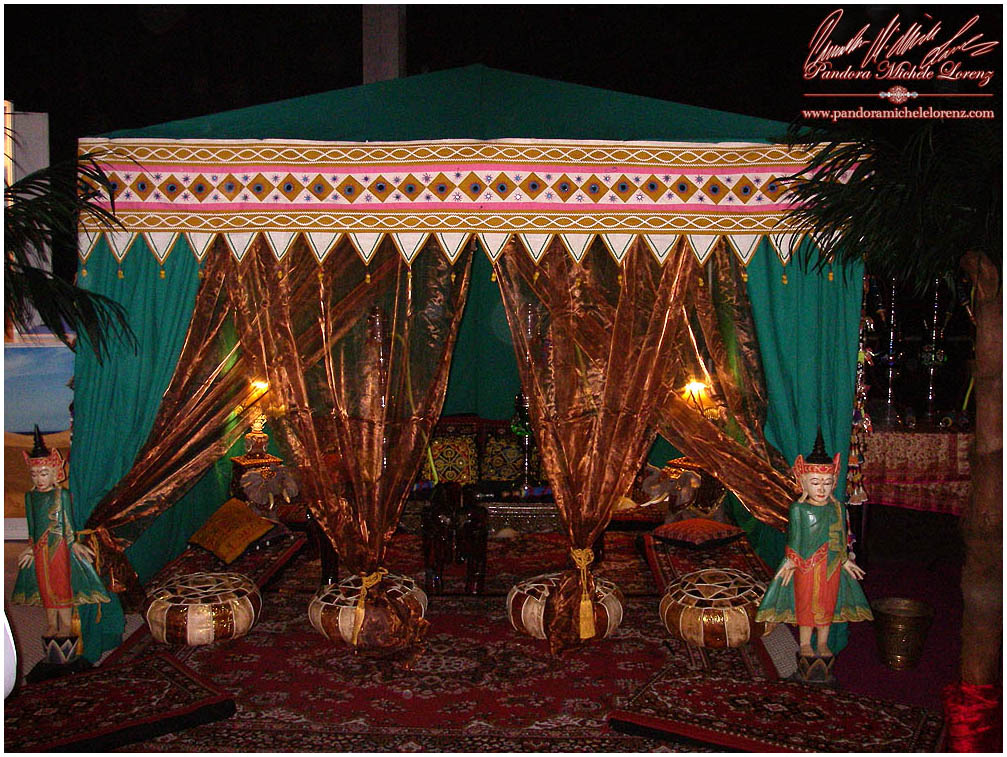 Die Luxus Variante wäre mit besonders aufwendige, luxuriöse, prachtvoll Dekorationselemente im Antik Design, wunderschön eingerichteter großer Lounge Bereich vor dem Zelt, mit z. B. Palmen, Teppiche, Ledersitzkissen, Teppichsitze, Teetische, Schaffelle, in filigraner aufwendiger Arbeit gemeisselte und vergoldete Bodenleuchten Eisenlaternen, ...