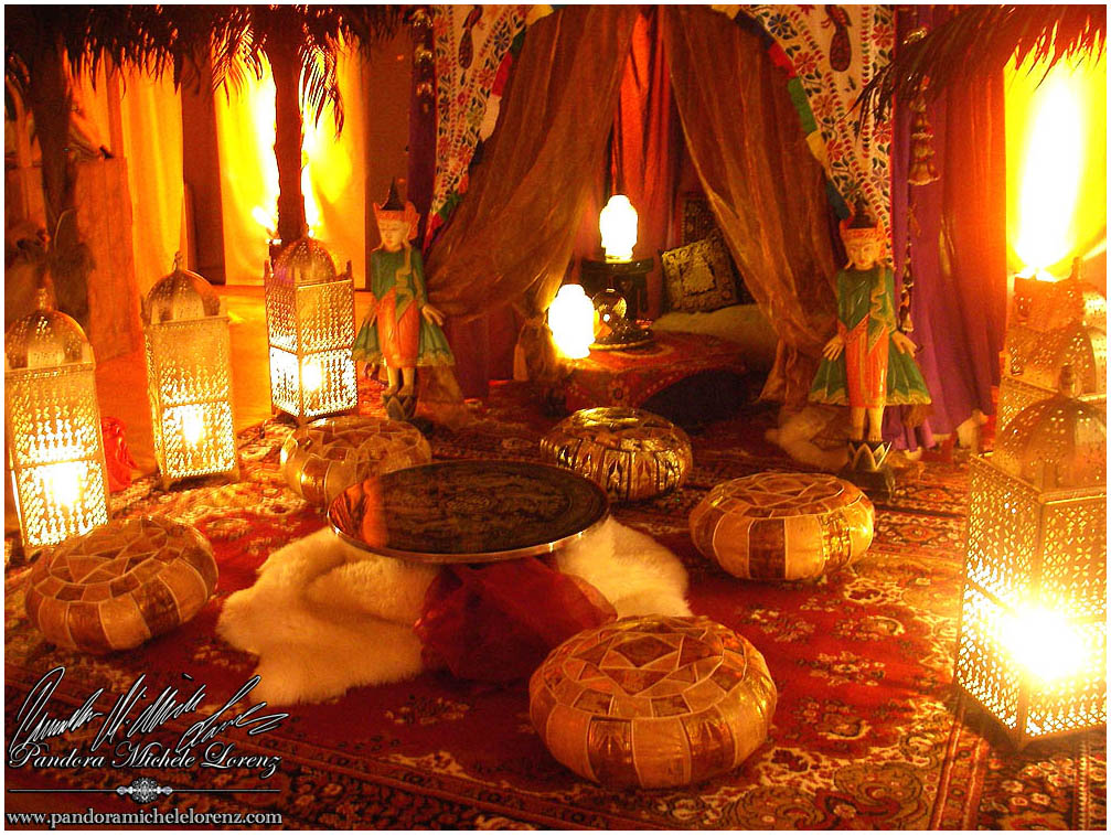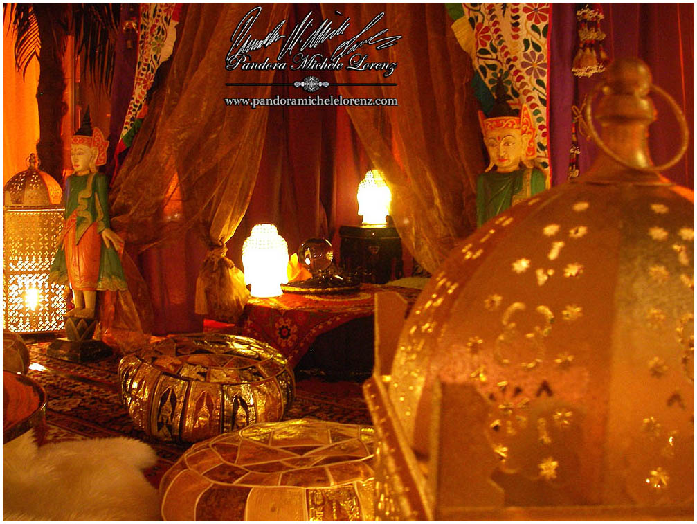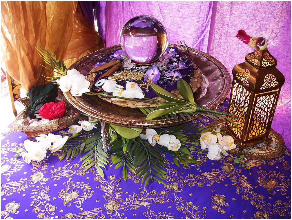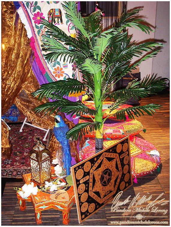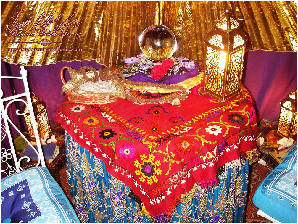 komplett dekoriertem Wahrsagerzelt, mit entspannender Hintergrundsmusik,